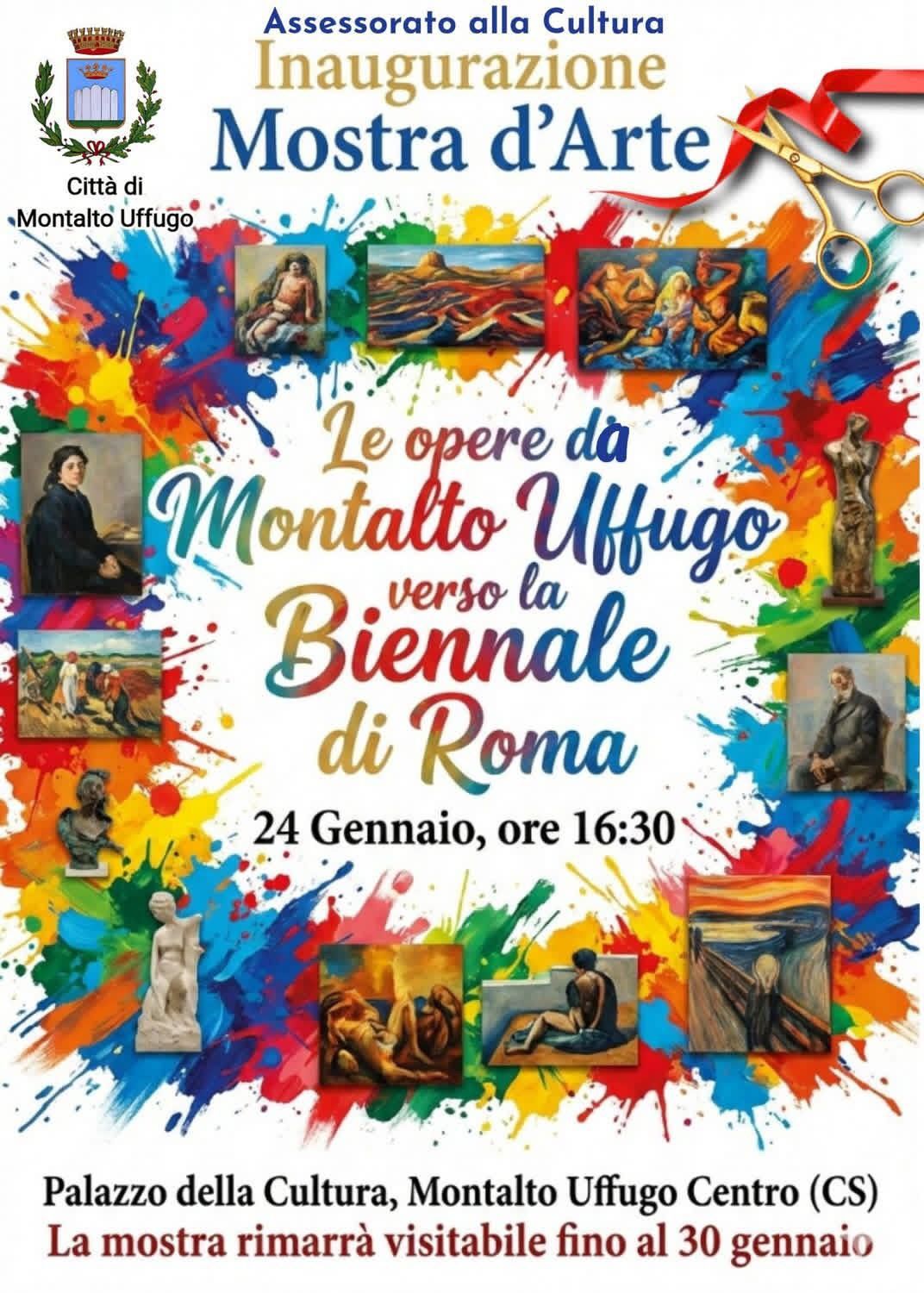 Il prossimo 24 gennaio, alle ore 16:30, verrà inaugurata la mostra “Le opere esposte a Montalto Uffugo verso la Biennale di Roma”, un evento che segna una tappa storica nel percorso di valorizzazione artistica e culturale del territorio.