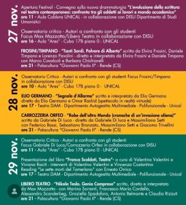 Realizzato con il sostegno della Fondazione Carical e in collaborazione con Disu – Dipartimento di Studi Umanistici e l’associazione Entropia Dam – Dipartimento Autogestito Multimediale dell’Unical, dal 27 al 29 novembre vedrà in programma tra gli spazi dell’Università della Calabria e il Palacultura “Giovanni Paolo II” di Rende quattro spettacoli tra i più apprezzati e premiati del teatro contemporaneo.